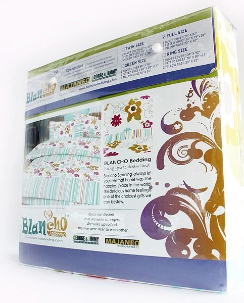 Five-piece set for Twin size (consisting of a pillow sham, a fitted sheet, a duvet cover, a comforter & a pillow);Seven-piece set for Full, Queen and King Size (consisting of two pillow shams, a fitted sheet, a duvet cover, a comforter and two pillows);Twin (Fitted sheet: 39 x 75 inches; Duvet cover and Comforter: 67 x 87 inches; Pillow sham and Pillow: 20 x 30 inches); Full (Fitted sheet: 54 x 75 inches ; Duvet cover and Comforter: 76 x 87 inches; Pillow sham and Pillow: 20 x 30 inches);Queen (Fitted sheet: 60 x 80 inches; Duvet cover and Comforter: 87 x 90 inches; Pillow sham and Pillow: 20 x 31 inches); King (Fitted sheet: 78 x 80 inches; Duvet cover and Comforter: 104 x 92 inches; Pillow sham and Pillow: 20 x 31 inches);*Blancho Bedding products are all made of high quality certified fibers, highest quality construction, chemical and fire retardant free. Allergy-free nontoxic natural bedrooms is our specialty.*The concealed elastic band in the fitted sheet will firmly wrap the overall corners of the mattress, thus avoiding displacement. The design of extending the pocket size of the fitted sheet to 14 inches will fit with the most of mattresses.*We recommend duvet covers because they can be washed much more often than can your quilted comforter. Too-frequent washing (even dry cleaning) can compromise your comforter's down fill. However, a cotton duvet cover can be laundered along with the sheets and pillowcases. This keeps the down comforter fresh as well. If you have ever priced dry cleaning for a fine comforter, you understand why cleaning it less often is a huge advantage!*Another advantage of cotton duvet covers is that they are changeable, so you can change the look and feel of your bedroom without having to completely redecorate. Browse our colorful duvet cover sets and bring excitement to your bedroom. Twin size contains a pillow sham, a fitted sheet, a duvet cover, a comforter and a pillow.Twin size comforter measures 67 by 87 inches with 40 oz hypo-allergenic breathable filling.This combo combines a duvet cover set, a down-alternative comforter and two pillows(one for Twin).Shrinkproof, anti-pilling and fading proof processes; 14 inches pocket size of the fitted sheet.Environment-friendly dyes; Fine and concentrated stitches; Machine washable and dryable.