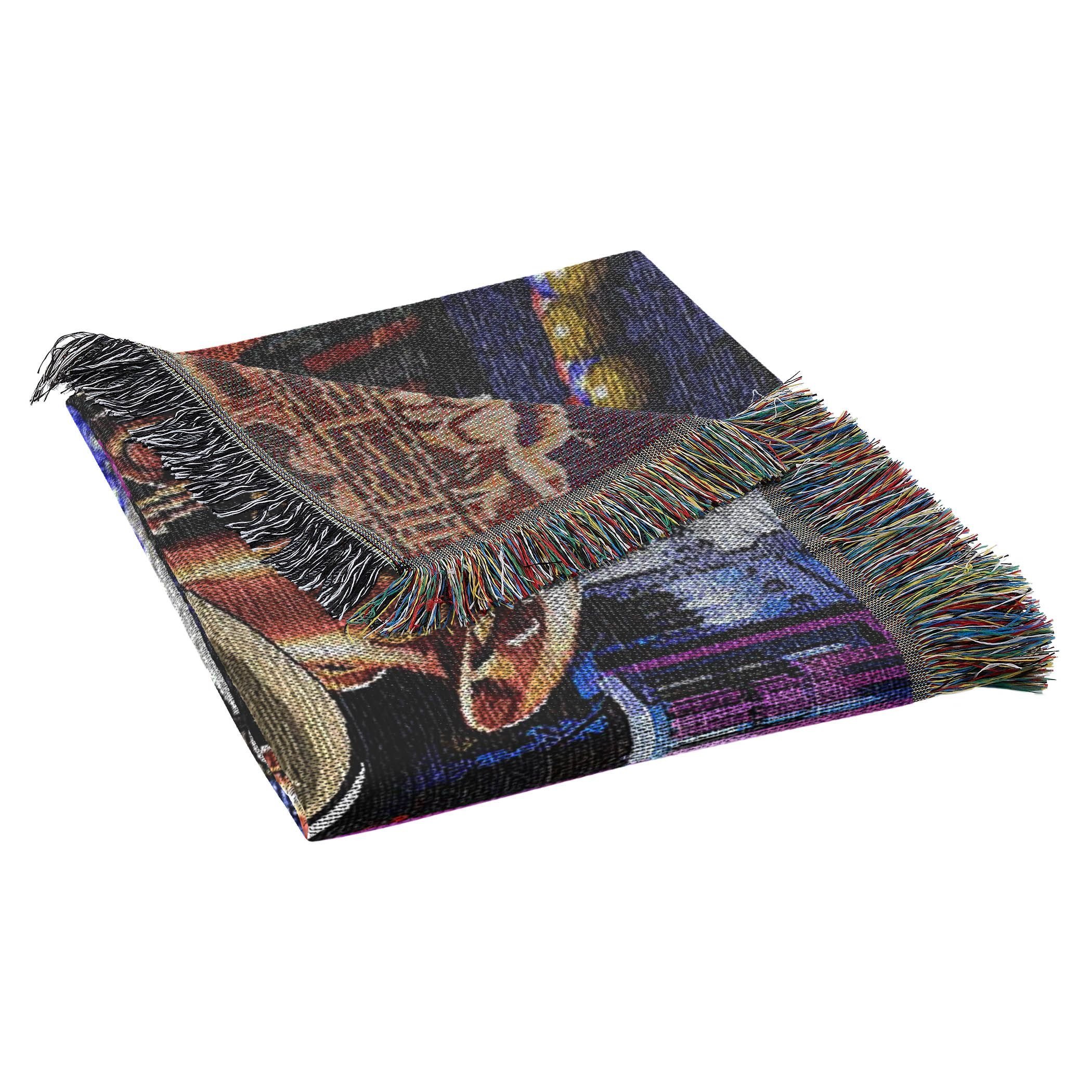 Detailed, woven tapestry; decorative fringes around all edges; made in America